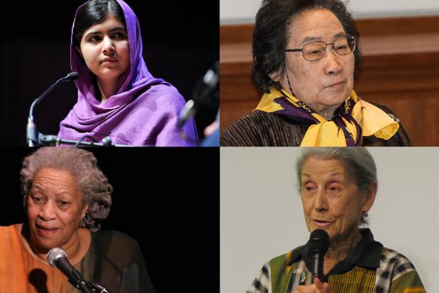 Photos: Malala Yousafzai — Southbank Centre through Creative Commons Attribution 2.0 Generic License; Tu Youyou — Bengt Nyman through Creative Commons Attribution-Share alike 4.0 International;Toni Morrison — Angela Radulescu through Creative Commons Attribution-Share alike 2.0 Generic License; Nadine Gordimer — Vogler through Creative Commons Attribution-Share alike 3.0 Unported